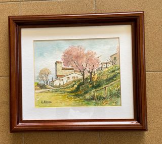 Preciosa acuarela original del artista LL. Rovira. Representa una escena rural con una casa y árboles en flor. - Firmada por el artista. - Marco de madera incluido. - Medidas sin marco 34 x 28 cm con marco 53 x 47 -Enmarcada con cristal