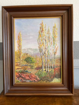 Pintura al óleo de un paisaje rural, firmada y fechada en 1983. - Representación de árboles altos y vegetación otoñal. - Incluye un pequeño caserío en el fondo. - Marco de madera con detalles. - Firmado por el artista F.H. -Medidas 34 x 42 cms con marco