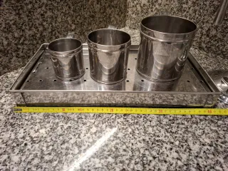 Conjunto de utensilios de acero inoxidable para lechería Años 60 - Incluye 3 jarras de diferentes tamaños. - Bandeja metálica con perforaciones para drenaje. - Embudo de acero inoxidable con soporte.
