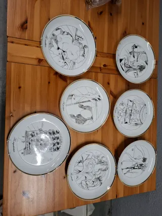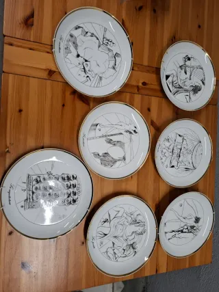 Conjunto de siete platos decorativos con diseños pintados por Salvador Dalí. Cada plato representa un arte segun Dali. - Bidasoa Año 1980, edicion limitada - Borde dorado.