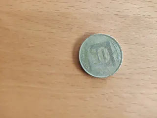 Moneda antigua con diseño grabado. - Diseño circular con inscripciones. - Grabado central con figura geométrica.