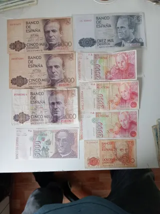Conjunto de 124 billetes españoles de diferentes épocas y valores. !!!HAY BILLETES DE 100 CON SERIES CONSECUTIVAS Y NUEVECITOS!!! - Incluye billetes del Banco de España. - Diversas denominaciones visibles como 100, 500, 1000, 2000, 5000 y Diez Mil pesetas. - Algunos billetes presentan signos de uso y paso del tiempo. Se añaden aparte varios dado todo. Se envían los 124 billetes de las fotografías.