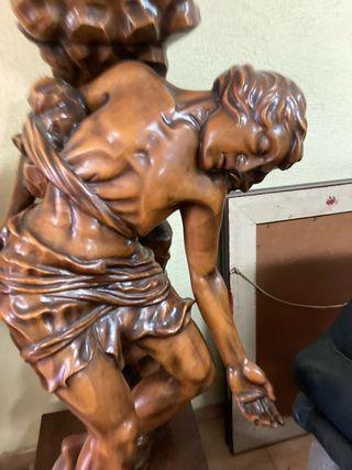 Figura de madera tallada con un reloj integrado. La pieza representa una figura humana con un diseño detallado. - Material: Madera tallada. - Reloj funcional. - Funciona a cuerda va perfecto Precio algo negociable