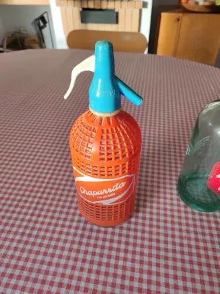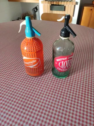 Lote de dos sifones antiguos, uno de la marca Chaparrita y otro Clotet. El precio es para los dos. - Sifón Chaparrita de color naranja con rejilla. - Sifón Clotet de vidrio verde con etiqueta. - Piezas de colección.
