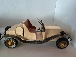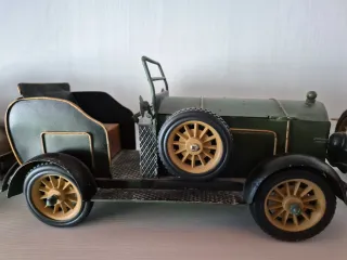 Este coche de metal es una pieza decorativa con un estilo vintage. - Diseño de coche antiguo. - Acabado en color crema y detalles en negro. - Ruedas doradas. No se venden por separado