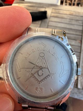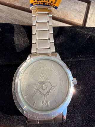 Elegante reloj con diseño masónico. - Esfera con el símbolo de la escuadra y el compás. - Inscripción A.·. L.·. G.·. D.·. G.·. A.·. D.·. U.·. - Correa metálica plateada. - Resistente al agua.