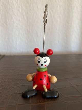 Figura decorativa con forma de mariquita, ideal para dar un toque divertido a cualquier espacio. - Cuerpo de madera pintado. - Detalle de puntos negros. - Base con clip para sujetar notas o fotos.