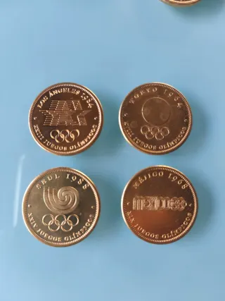 Conjunto de cuatro monedas de colección conmemorativas de los Juegos Olímpicos, acuñadas en la Real Casa de la Moneda de Holanda. En metal con baño de oro de 22 quilates. - Moneda de JJOO Seúl 1988. - Moneda de JJOO México 1968. - Moneda de JJOO Tokio 1964. - Moneda de JJOO Los Ángeles 1984.