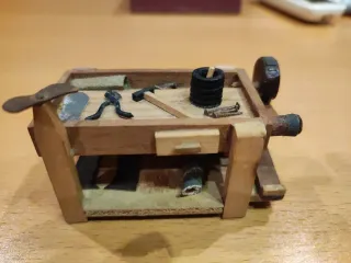 Detallada miniatura de un banco de trabajo artesanal, perfecto para coleccionistas o maquetas. Mide 7'5x5cm - Incluye diversas herramientas en miniatura. - Construcción en madera Tengo mas miniaturas en mi perfil, si te interesa mas de una te hago un 15%.