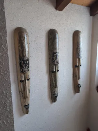 Conjunto de tres máscaras africanas decorativas, perfectas para añadir un toque exótico a tu hogar. Cada máscara presenta un diseño único y detallado. - Material: Madera. - Acabado: Pintado a mano con detalles en negro y beige. - Estilo: Tradicional africano. - Uso: Decoración de interiores. - mascaras de 150 cm altura Es UN juego de 3 màscaras, SE venden las 3 por 90 euros o 45 euros la unidad