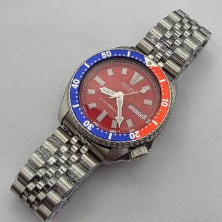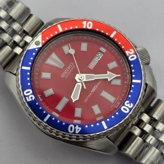 Reloj automático Seiko modelo 6309-7290 con movimiento revisado. Esfera roja y bisel bicolor. - Caja de acero inoxidable. - Correa de metal. - Resistente al agua 150m.