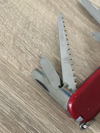Navaja suiza clásica multiusos de acero inoxidable Victorinox Climber de color rojo brillante. Se ha limpiado con ultrasonidos y se ha engrasado posteriormente. Incluyo rabiza del color que elijas.