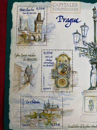 Serie de sellos de Francia de la colección Capitales de Europa, con la ciudad de Praga como protagonista. Incluye imágenes de monumentos emblemáticos.