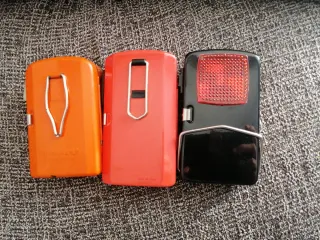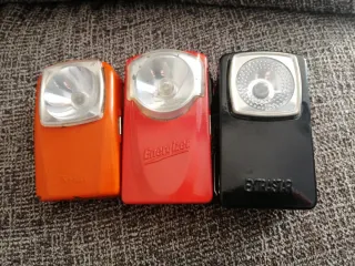 Conjunto de tres linternas vintage tipo petaca. - Linterna naranja Tximist. - Linterna roja con logo Energizer. - Linterna negra con logo EXTRASTAR.