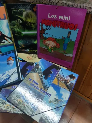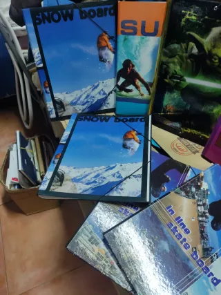 Conjunto de 8 carpetas archivador con diseños llamativos. - Portadas con imágenes de deportes de acción como snowboard y skate. - Ideal para organizar documentos y apuntes.