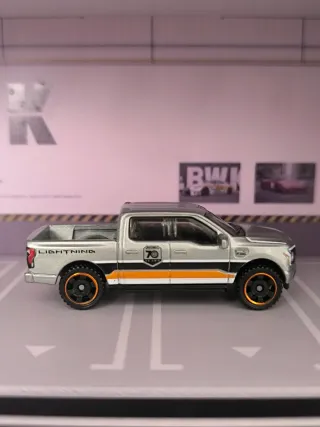 Matchbox 70 aniversario Ford F-150 Lightning. Procedente de colección personal de vitrina. - Color plateado con detalles naranjas. - Ruedas negras con aro naranja.