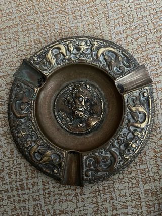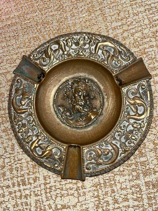 PRECIO NEGOCIABLE Elegante cenicero antiguo fabricado en bronce macizo. Presenta un diseño detallado con un rostro central y motivos decorativos; con relieves de figuras históricas o mitológicas - Material: Bronce o latón macizo. - Diseño: Rostro central y ornamentación. - Estilo: Antiguo.