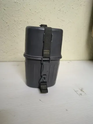 Kit de cantimplora y latas para cocinar de origen alemán. El conjunto está fabricado en metal resistente y cuenta con una correa de sujeción. Se conserva en muy buenas condiciones. - Color gris oscuro. - Correa de sujeción con hebilla.