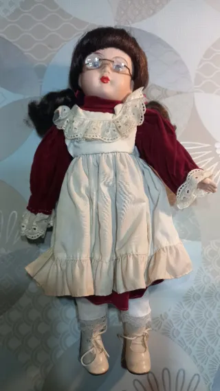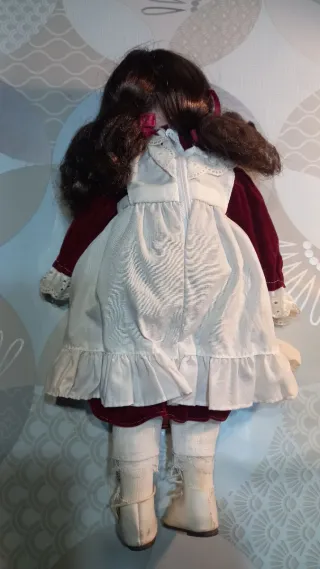 Preciosa muñeca de porcelana con un diseño clásico y elegante. - Solo la cabeza, las manos y los pies, son de porcelana, el resto del cuerpo es de trapo. - Vestido de terciopelo burdeos. - Delantal blanco con encaje. - Medias blancas con detalles de encaje. - Zapatos blancos con cordones. - 40 centímetros de altura.