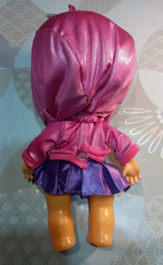 Muñeca llorona, 30 centímetros de altura. Tiene un mecanismo en la parte de atrás, que si lo activas, cuando le quitas el chupete de la boca, llora y hace ruidos.