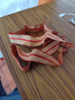 Cinta con lazo y corona mural. - Diseño de tres colores: rojo, amarillo y morado. - Adorno metálico dorado con forma de corona mural. posiblemente para niña o mujer,adorno con la bandera republicana Republica española 1931-1939.