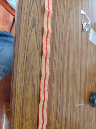Cinta de galón,para brigada especialista decorativa con diseño militar en tonos dorados y rojos,ancho 3 cm ,largo 89cm ,de hilo metálico de gran calidad - Diseño de rayas rojas sobre fondo dorado. - Textura brillante y festiva.