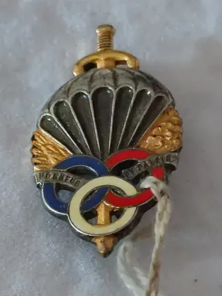 Insignia de paracaidista francés con detalles de paracaídas, espiga de trigo y anillos olímpicos. - Diseño con esmalte tricolor (azul, blanco, rojo). - Inscripción HONNEUR ET PATRIE en la cinta. Fabricante Drago
