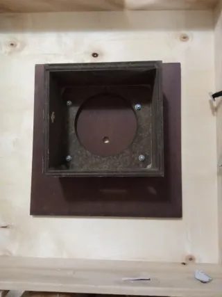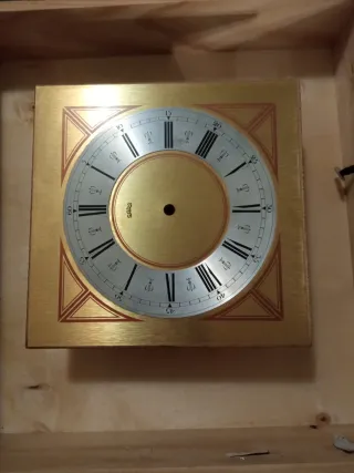 Caja de madera para la esfera de un reloj de pared. Presenta un diseño cuadrado con detalles dorados y un marco interior con motivos geométricos. - Material: Madera. - Color: Dorado y madera natural. - Diseño: Cuadrado con detalles geométricos.