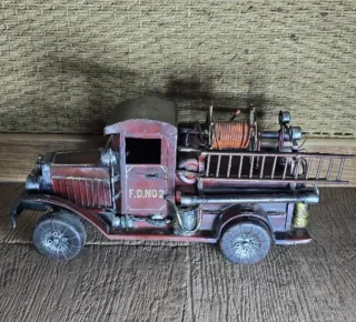 Réplica de camión de bomberos clásico (estilo años 20) fabricado integramente en metal.Es una pieza robusta y con mucho detalle de la casa Romimex World. Material: Metal con acabado enveiecido/ patinado original Detalles: Incluye escaleras laterales, mangueras enrolladas, campana frontal y detalles de "F.D. NO 2".