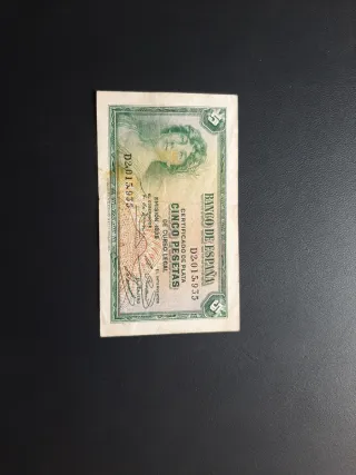Billete de España circulado de 5 pesetas de 1935 con serie D. Posibilidad de envío ordinario bajo responsabilidad del comprador. Crea tu lote o anuncio con los billetes que quieras. VENDIDO A MONEDAS Y BILLETES.
