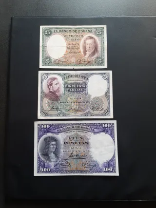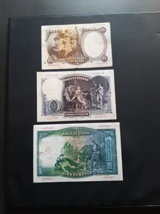 Lote de 3 billetes de España circulados de 25, 50 y 100 pesetas de 1931 SIN SERIE. Posibilidad de envío ordinario bajo responsabilidad del comprador. Crea tu lote o anuncio con los billetes que quieras.