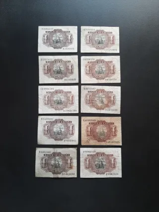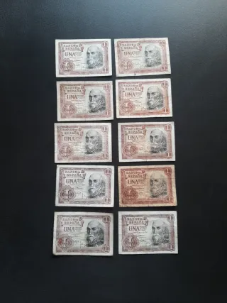 Lote de 10 billetes de España circulados de 1 peseta de 1953 todos con serie. Posibilidad de envío ordinario bajo responsabilidad del comprador. Crea tu lote o anuncio con los billetes que quieras.