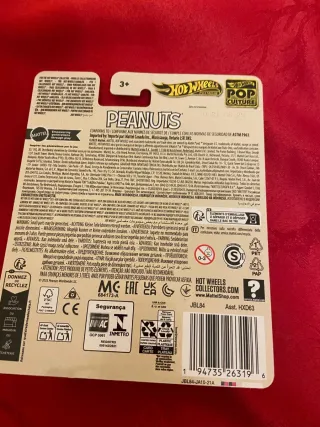 Coche de colección Hot Wheels Premium de la línea Pop Culture. - Diseño inspirado en Snoopy de Peanuts. - Modelo HXD63. - Incluye Real Riders y Metal/Metal.