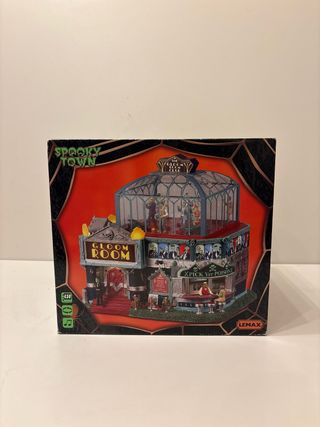 Figura decorativa de Lemax Spooky Town, The Gloom Room Club. - Edificio de dos niveles con figuras. - Diseño temático de Halloween. - Incluye letrero Gloom Room y X Pick Yer Poison.