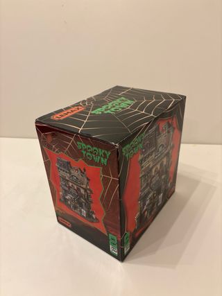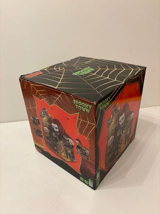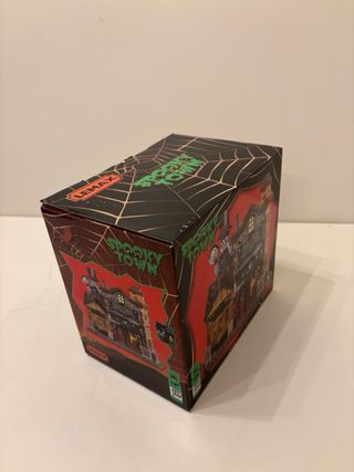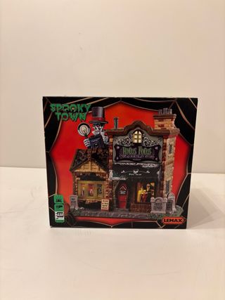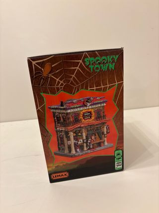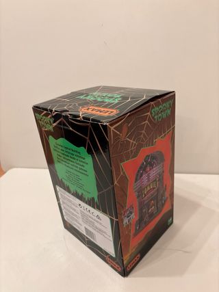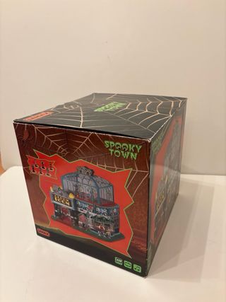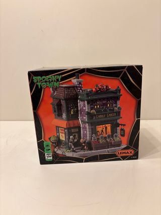 Figura de la colección Spooky Town de Lemax, modelo Ghoul Grocer. - Edificio de dos plantas con temática de Halloween. - Detalles como calabazas, lápidas y figuras. - Incluye señalización Ghoul Grocer y Fresh Produce.
