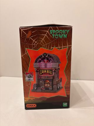 Figura de la colección Spooky Town de Lemax, modelo Zombie Records. Ideal para decoraciones de Halloween. - Diseño detallado de tienda de discos de zombis. - Incluye iluminación. - Funciona con 4.5V.