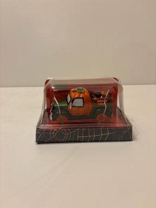 Figura decorativa de una camioneta con temática de Halloween. - Camioneta con diseño de calabaza. - Carga de calabazas en la parte trasera. - Base con diseño de telaraña.