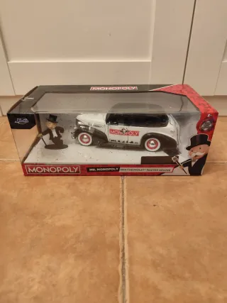 Réplica detallada del coche Mr. Monopoly, un Chevrolet Master Deluxe de 1939. Hollywood Rides. - Incluye figura de Mr. Monopoly. - Diseño clásico en blanco y negro. - Caja expositora con licencia oficial Monopoly.