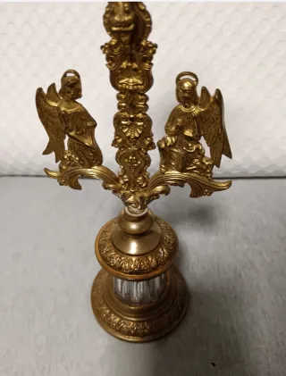 Elegante cruz relicario de sobremesa con un diseño Neogótico. - Acabado dorado. - Figuras de ángeles a los lados. - Base con detalles ornamentales.