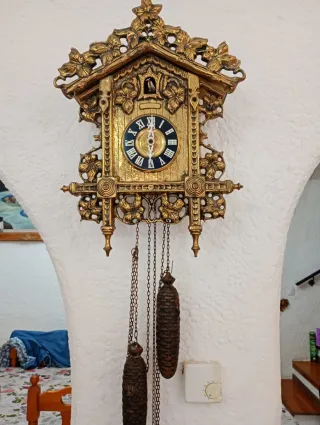 Este es un reloj de cuco decorativo con un acabado dorado. - Diseño ornamentado con hojas y detalles. - Incluye péndulo y pesas en forma de piña. - El cuco se asoma desde una pequeña ventana.( Medias 48cm x 34cm)