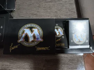 Caja de Magic The Gathering Pro Tour de Nueva York de 1996. - Incluye cartas y material del evento. - Diseño con logo de Magic The Gathering y Pro Tour. - Firma de Poulter y Justic.