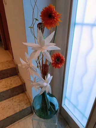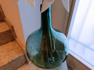 Bonita damajuana de vidrio en color verde, con un diseño clásico y elegante. Perfecta como elemento decorativo. Vidrio soplado a mano. Se nota en la imperfección de la damajuana En las últimas décadas se ha utilizado de decoración con estas flores artificiales ( Edelweiss, girasoles), que dan un sencillo, fino, pero bonita impresión. Sinó también puede servir expuesta sola. Medidas botella: 39 cm altura x 29 cm perímetro. MÁS COSAS EN MI PERFIL.