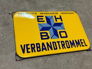 Cartel esmaltado antiguo de la Koninklijke Nederlandse Vereniging EHBO. - Diseño en amarillo y azul. - Texto VERBANDTROMMEL en la parte inferior.
