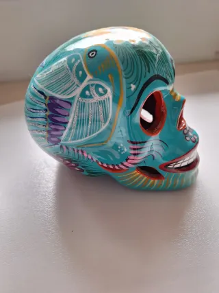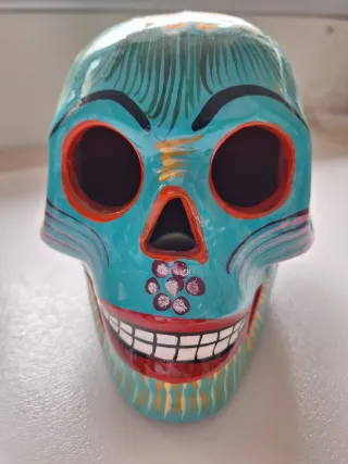 Calavera decorativa de estilo mexicano. - Diseño colorido y detallado. - Acabado brillante.