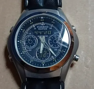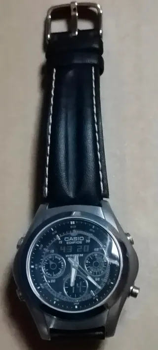 Reloj Casio Edifice EFA-114 con correa de cuero. - Esfera azul. - Indicador de día de la semana. - Función de iluminación. - Resistente al agua (WR 100M). Nota.- El reloj está flamante pero tiene un defecto. El Botón derecho inferior, no es el original de este modelo. Al poco tiempo de estrenar el reloj, se desprendió y se perdió. Se montó uno de otro modelo de Casio. Sobresale y pierde hermetismo al contacto con agua. Tener muy en cuenta este detalle fundamental.