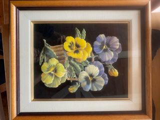 Precioso cuadro decorativo con flores de porcelana en relieve. - Diseño floral con detalle de cesta. - Flores en tonos amarillos y morados. - Marco de madera.