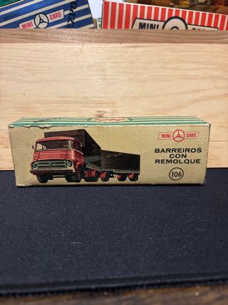 Caja de juguete Mini Cars número 106, modelo Barreiros con remolque. Años 70 - Diseño clásico de camión y remolque. - Ilustración detallada en la caja.