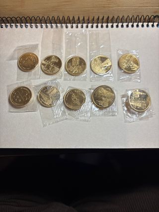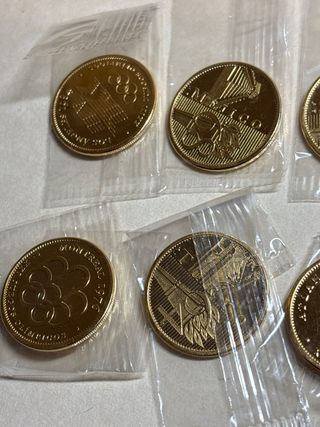 Conjunto de 10 medallas con baño de oro de 24 quilates. Protegidas en su plástico original - Diseño conmemorativo de eventos olímpicos. - Cada medalla viene protegida individualmente.