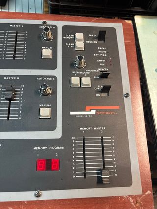 Controlador de luces vintage Spotlight modelo 12/30. Un equipo electrónico con un diseño retro. - Panel frontal con faders y botones. - Pantalla digital para MEMORY PROGRAM. - Controles MASTER A, MASTER B, AUTOFADE A, AUTOFADE B. - Botones PREVIEW, FLASHER, PRESET 1, PRESET 2.