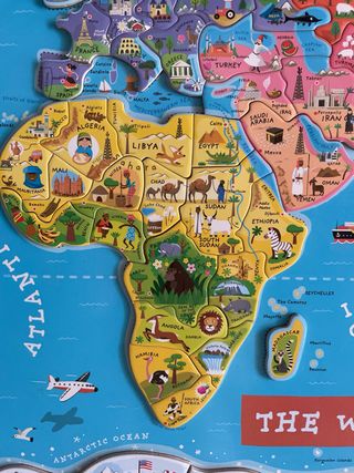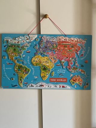 Mapa del mundo educativo de la marca Jonod, ideal para colgar en la pared. Presenta los continentes y países de forma colorida y con ilustraciones. - 70x42 cm - No falta ninguna pieza - Paises con imanes - Diseño de mapa del mundo. - Marca: Jonod. - Incluye cuerdas para colgar.